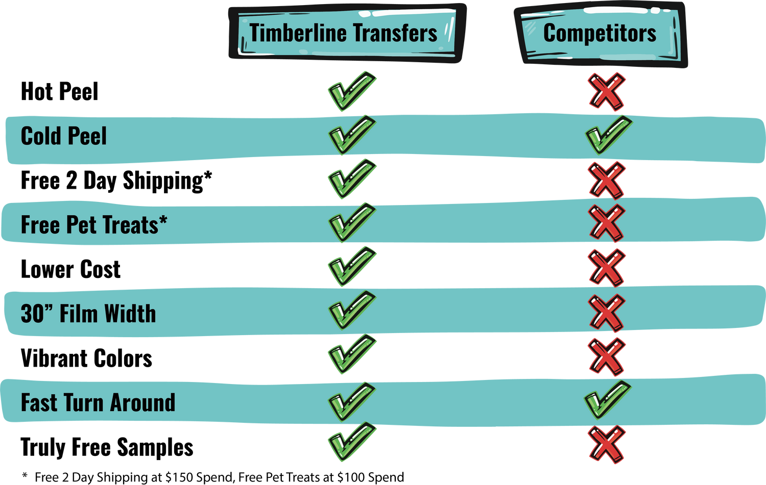 Our Transfers are TRUE hot peel. Unlike others that advertise as hot peel but really mean warm peel, our will truly hot peel saving you time on those large production runs.